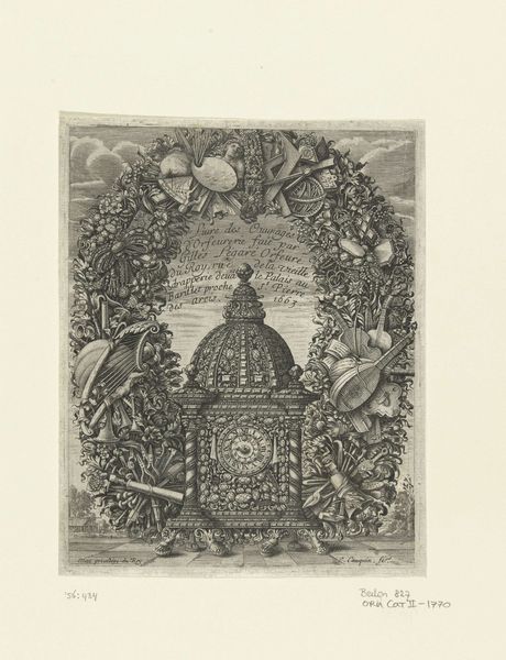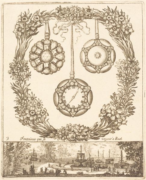 Balthazar Moncornet created this print, "Flower Garland with Watch Cases, with the Garden of the Chateau de Ruel Below," in the 17th century using etching. The composition features a wreath of flowers surrounding three ornate watch cases. The flower garland is a potent symbol, reminiscent of ancient Roman funerary wreaths, signifying both beauty and the cyclical nature of life. This motif echoes through Renaissance art, often adorning portraits as emblems of virtue or achievement. Here, it frames the watches, objects representing time's relentless march. The watches, hanging suspended, evoke a memento mori—a reminder of mortality—a theme prevalent in Dutch Golden Age art. The image suggests a poignant tension: the ephemeral beauty of the flowers juxtaposed with the cold precision of timekeeping. This contrast engages our subconscious awareness of time's passage, a universal anxiety that transcends eras, prompting reflection on the fleeting nature of existence and the enduring human quest to measure and master it.