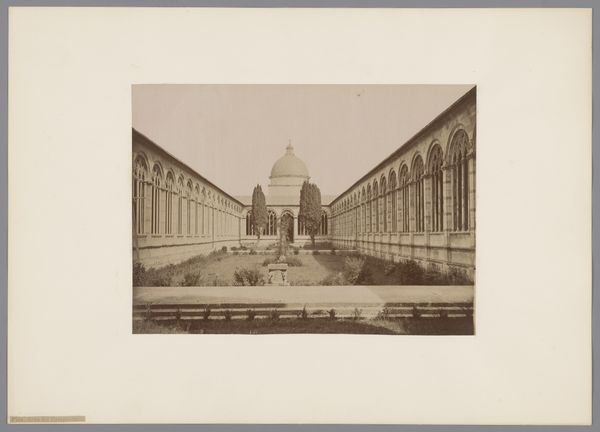 Editor: Here we have Francis Frith’s photograph, "St. Peter's, Rome." It's a fascinating image, capturing the grandeur of the architecture, but I'm curious about its production. What can you tell me about the materials and processes involved in making it? Curator: Well, this is likely an albumen print, a process that dominated photographic printing in the mid-19th century. Think about the labor involved: coating paper with egg whites, sensitizing it with silver nitrate, exposing the negative, and then meticulously developing and toning the print. The materiality and the labor are key to its value as an object, wouldn't you agree? Editor: Absolutely. It’s easy to forget the intensive work behind a single image. I hadn’t considered the significance of albumen printing in terms of labor and materials before. Thanks! Curator: My pleasure. Looking at the means of production is so relevant to understanding its cultural impact.