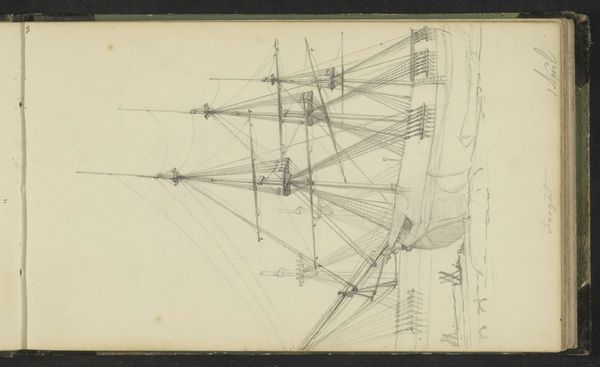 Curator: Before us is a sketch, found in a sketchbook, titled "Zeilschip voor anker bij een meerpaal," which translates to "Sailing Ship Anchored by a Mooring Post," created by Johannes Christiaan Schotel. The Rijksmuseum places its creation somewhere between 1797 and 1838. It’s rendered in pencil and ink. Editor: My immediate impression is one of sparseness. The blank left-hand page emphasizes the skeletal precision of the rigging, almost like a musical score waiting to be filled with the wind's composition. It's about suggestion rather than a fully realized picture, focusing almost clinically on line. Curator: Precisely! Note how the artist employed minimal shading, really just pure line work. This emphasizes a particular understanding, where symbolic clarity surpasses literal depiction. It speaks to a cultural memory of the sea. These ships carried a certain weight for the Dutch, and here, it is reduced to its essence. The pen is like a surgeon's tool, mapping trade routes, colonial power, but on a very personal scale. Editor: And let’s consider Schotel's possible social position and economic connections. Sketches like this are studies and yet they demonstrate an element of technical labor: the practice involved in shipbuilding. We see the knowledge that resides in his hand, mediating skill through line, craft reduced, and reproduced for study, and likely for later transformation in an atelier into something else. Was this sketch preparatory or exploratory? It asks what the conditions are to arrive to fully finished paintings with wide market appeal. Curator: Perhaps both? It’s tempting to read into this drawing the uncertainty of the era. The Netherlands experienced massive upheaval in the period this work was made, from French occupation to the establishment of the Kingdom. The anchored ship— a recurring motif across Dutch art—can carry that historical resonance, a silent witness resting on the waters, tethered and in anticipation. Editor: But its very incompletion resists easy symbolic reading! It pulls back the curtain, or opens the covers as we see here, of a working practice in which sketches act as vital parts in larger economic networks in painting. The work embodies process itself! Curator: I concede the image refuses closure; perhaps, that's its enduring power. The suggestion is itself the substance. Editor: Ultimately, both the precision and the provisional quality combine in its affective force.