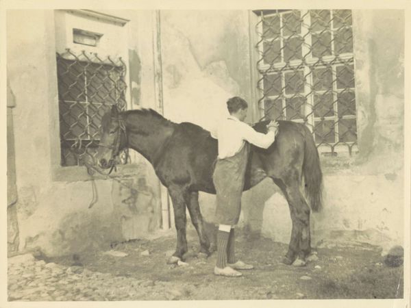 Editor: This is a photograph, taken around 1912 by Frits Freerks Fontein Fz., titled "Man in een wit tropenpak op een paardje in het Indonesische landschap" – "Man in a white tropical suit on a horse in the Indonesian landscape." It feels very staged, almost performative. What do you see in this piece, beyond the obvious? Curator: I see a potent image of colonial power relations at play. The man, dressed in a pristine white suit—a stark visual contrast to the landscape and, implicitly, its inhabitants—is literally elevated above the environment, a posture of dominance. What does that sartorial choice signify to you? Editor: It screams 'outsider,' someone trying – and failing – to blend in. It's almost satirical, the whiteness so aggressively…white. Curator: Precisely. Consider how photography, especially during this period, was used as a tool to construct and disseminate colonial narratives. This image contributes to a larger discourse of Orientalism, where the 'East' is romanticized, exoticized, and ultimately, subjugated. How does that make you feel? Editor: Uncomfortable. I see the beauty of the landscape, but I can't separate it from the history. The staged nature makes it feel even more artificial and constructed. Curator: It is crucial that we engage with art like this critically, acknowledging the complex and often problematic histories embedded within them. This photograph isn't just a portrait; it's a document of power, a reflection of unequal global dynamics, and a reminder of the lasting impact of colonialism. How can this image challenge contemporary audiences to consider our world? Editor: By forcing us to confront uncomfortable truths about the past, and how those power structures still resonate today. Thank you. Curator: A critical approach opens pathways to better understanding of ourselves and the art itself.