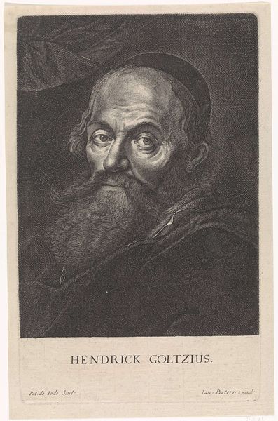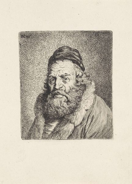 Editor: Here we have Giovanni Domenico Tiepolo's "Oude man met baard," an engraving from around 1774. I'm struck by the incredible detail achieved with what I assume were very precise lines. What formal elements jump out at you in this portrait? Curator: The first thing I observe is the mastery of line. Note how the density and direction of the lines are deployed to model form and suggest tonal variations. The hatching and cross-hatching are particularly evident. The lines create textures— the beard, the fabric, the very skin of the subject, achieving a remarkable verisimilitude. How do you think the artist created such variations in tone using only line work? Editor: Perhaps he varied the thickness and spacing of the lines? I also notice how the lines seem to radiate outward from the forehead and curve to define the planes of the face. It’s very effective in creating depth. Curator: Precisely. The strategic manipulation of line weight and density, and attending to directional changes are crucial in giving dimension. Semiotically, line operates as a signifier not only of edge but also of form, texture, and light itself. Tell me, does the stark contrast in tone create a certain dynamism, perhaps a visual hierarchy within the composition? Editor: Definitely. The lighter areas draw my eye, especially the forehead and parts of the beard, while the darker areas recede. The cap framing the top of the head almost feels like it is creating a visual frame within the image. I hadn’t considered how all those elements play together. Curator: And therein lies the power of formalism, uncovering the mechanics of meaning through close observation. Editor: I see that. Paying attention to those specific choices really unlocked the image for me. Curator: Indeed, appreciating the artistry inherent in Tiepolo's deployment of line and tone affords an entrance into decoding the structural and material sophistication in play.