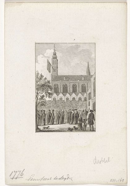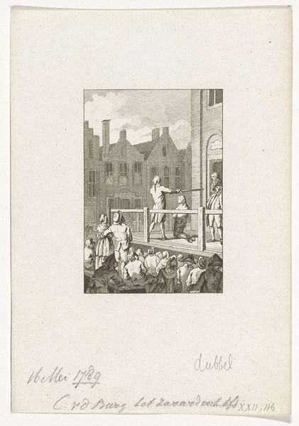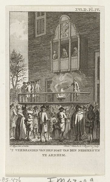 This etching, "Verbranding van de Post van den Neder-Rhijn, 1786," was created by Reinier Vinkeles. Note how Vinkeles uses the precise medium of etching to meticulously render a scene of public spectacle. The building and the crowd are depicted in fine detail. The architectural structure and the platform create a stage for the central action of the burning of the post. A semiotic reading reveals how the burning becomes a symbol of protest, challenging the authority represented by the printed word. Vinkeles uses formal composition and structured form to engage with ideas around power, rebellion, and the role of public action. The placement of figures and the carefully rendered architecture suggest an engagement with the cultural codes of civic unrest and political statement. The artwork functions as a historical document. However, it also reflects an ongoing interpretation of the relationship between people, power, and representation.