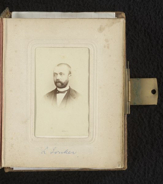 Curator: Here we have "Portret van een man met snor," or "Portrait of a Man with a Moustache," attributed to Lock & Whitfield, and dating from around 1856 to 1894. It’s quite small, presented as an albumen print. Editor: It feels intensely intimate. Something about the focused expression coupled with the photograph's clear age. It’s aged beautifully; you can really feel the passage of time. Curator: Absolutely, and that's partially due to the photographic processes employed. The albumen print, created with egg whites, sits inside a frame likely made of precious material—a physical manifestation of valued memory. The daguerreotype as a similar process made images precious commodities. This contrasts against our disposable digital images of today. Editor: The materiality is central, really. This wasn't a fleeting image; it was crafted and enshrined. Consider the labor too, not just of the photographer, but whoever bound the image. Was the photo intended for private circulation? Who made the conscious effort to place this individual in the visual record? Curator: It also raises the question of representation and the visual signifiers. The moustache and the man's direct gaze position him as a man of the age. To viewers then, he would immediately align himself with familiar societal archetypes—perhaps a man of ambition, and a distinct member of a bourgeoise that defined an era. Editor: But there's a softness as well, perhaps from the aging or from the inherent nature of early photographic printing, so we have this very precise depiction existing within a sort of gauzy aesthetic. It brings an odd complexity to it. Curator: It gives a sense of personality but perhaps an unknowable depth that adds to the charm of a seemingly straightforward photo. A window to another age. Editor: It does makes you think about who he was. More broadly it prompts thoughts of image saturation and the unique importance images held back then versus their constant accessibility now. Curator: Precisely. It serves as a quiet, evocative statement of its time. Editor: A solid piece of cultural and material history.