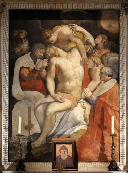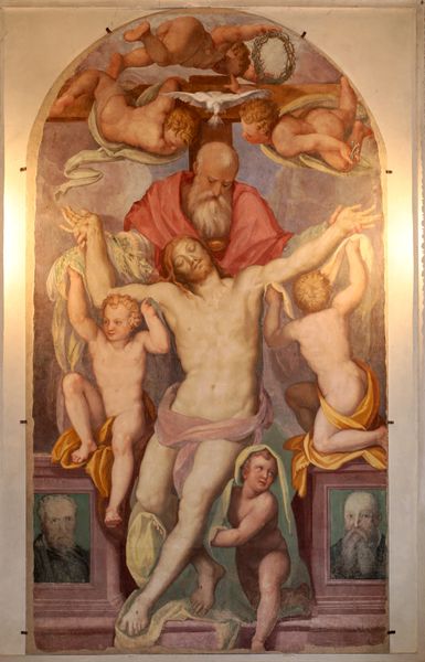 Curator: Well, I am instantly struck by the figures straining, reaching towards the light. There’s such dynamism, but also this deep, aching vulnerability. What do you make of it at first glance? Editor: You've keyed into a really emotional perspective of what's going on here. We're looking at Agnolo Bronzino’s “Christ in Limbo,” painted around 1552, and as you said, it's teeming with figures. The theme delves into Christ’s descent into Limbo to liberate righteous souls. It's a scene loaded with symbolic meaning about salvation. Curator: Salvation, yes, but also imprisonment, isn't it? Limbo itself speaks of being in between places, neither heaven nor hell, a space of waiting. And the way Bronzino has clustered those figures… almost claustrophobic, actually. Like they're desperate to break free. The visual tension feels very potent. Editor: Absolutely. Limbo, in medieval theology, held those denied entry to Heaven but not deserving of Hell – like those who died before Christ. But visually, Bronzino amplifies the yearning, doesn’t he? Note the stark contrasts, almost theatrical. The palette leans into earth tones to really heighten Christ's luminescent presence. Think about what that white flag, his beacon, means in that context. It creates this immediate reading for the viewer, where our eye gravitates from the shadows directly towards it and Christ himself. Curator: That contrast pulls so much weight, not only Christ's divinity, but that visual dichotomy. He is literally pulling them out of the shadows, in what visually feels like the last tug of hope to be seen and believed. It also makes you consider, doesn’t it, the notion of a historical versus an emotional truth, the iconography here as cultural storytelling and emotional impact. Editor: A superb distinction. The composition isn’t just representational; it actively participates in crafting belief. And if we return to considering what hope looks like, it gives that experience to us. These symbols carry the weight of collective hopes. What strikes me most about this painting is that, whilst the story might be traditional, its lasting impact depends on something other than mere fidelity. It triggers an imaginative, spiritual leap in the viewer. Curator: Yes, that spiritual leap, that echo through time, still so vital. This really is a deeply resonant work.