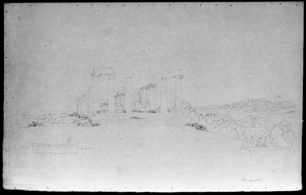 Curator: This is Lewis Vulliamy's rendering of the Temple of Apollo at Didyma, currently held in the Harvard Art Museums. The artwork measures 26.4 by 42.2 cm. Editor: My first impression is one of starkness, a quiet observation of architectural remnants against a vast landscape, conveying a sense of isolation and historical weight. Curator: The temple's ruins speak volumes about cultural memory—Apollo, the god of light and knowledge, contrasts with this image of decay, suggesting the ephemeral nature of even the most powerful symbols. Editor: Indeed, the rendering itself serves as an artifact—a record of Vulliamy's encounter with a site imbued with classical ideals, raising questions about how such imagery shapes our understanding of history and power. Curator: The surviving columns stand as enduring markers, their form echoing across time, reminding us of our human connection to the past. Editor: And prompting reflection on how we, in turn, will be remembered through our own cultural output.