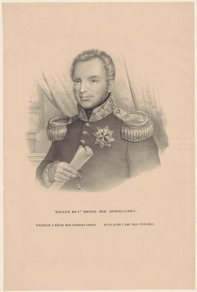This portrait of Willem I Frederik, King of the Netherlands, was made by Carel Frederik Curtenius Bentinck, using lithography, a printmaking process, on paper. Lithography allows for the creation of detailed images through a chemical process. The artist would have drawn on a stone or metal plate with a greasy crayon, then treated the surface so that ink adheres only to the drawn areas. This method, while seemingly straightforward, demanded precision and skill, as the artist had to master the properties of the materials to achieve the desired tonal range and clarity. The choice of lithography speaks to broader social and technological developments. It was a relatively new technology at the time and more affordable than engraving, allowing for wider distribution of images and thus playing a role in shaping public perception. So, in looking at this portrait, remember that the materials and making process are deeply connected to the social and cultural context of its time.