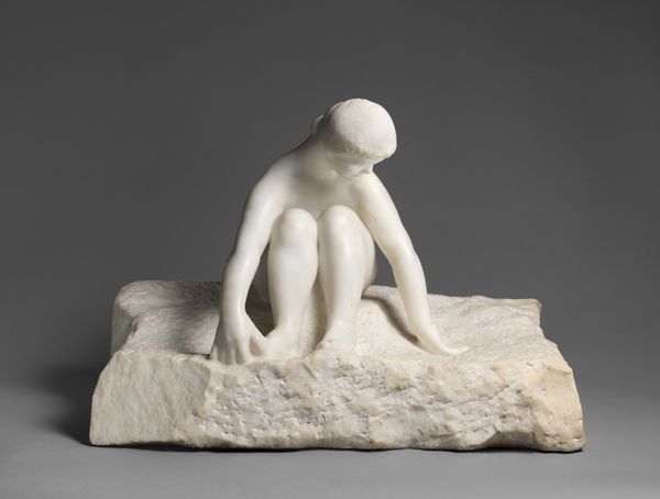 Editor: Here we have Auguste Rodin's "Study for Obsession," likely created between 1891 and 1912. It's a marble sculpture of a seated figure. I find it quite compelling; the figure's posture seems to convey intense introspection, maybe even despair. What do you see in this piece? Curator: This sculpture hits hard, doesn’t it? Looking at this piece, I’m immediately drawn to consider how Rodin is portraying internal conflict. Think about the late 19th and early 20th centuries – a time of great social upheaval and shifting identities. Does this pose – the inward gaze, the contracted form – perhaps reflect a sense of alienation that many felt amidst rapid modernization and industrialization? How might the suppression and oppression faced by different identity groups in that era inform our reading of this figure's bowed head and closed posture? Editor: That's interesting. I hadn't thought about the social context. So you’re saying the sculpture can be interpreted as representing more than just personal "obsession," but perhaps a broader societal unease? Curator: Exactly. Rodin’s figures often capture the anxieties and uncertainties of the time. Considering issues of gender, class, and race adds layers to our understanding. How does this piece resonate with contemporary dialogues about mental health and social isolation? And does the lack of clear facial features complicate, or perhaps universalize the narrative? Editor: I see what you mean. It's like Rodin is inviting us to project our own experiences onto the figure. This makes me see it in a completely different light. Curator: It's through that dialogue, between art, history, and our present-day concerns, that art truly comes alive. Thinking about this piece, I now wonder about the male gaze in sculpture, how can we engage with that productively here? Editor: Definitely something to think about. I’ll be pondering those questions!