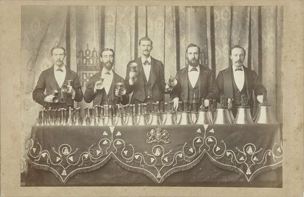 Editor: This is "Presbytery of Dundee," a gelatin silver print created between 1843 and 1847 by Hill and Adamson. It strikes me as very formal and imposing, even with the slightly blurred details. What stands out to you? Curator: The composition immediately commands attention. Notice the carefully arranged figures: the stability of the triangular grouping, the varying heights and postures creating a dynamic yet controlled rhythm across the surface. Observe how the light, diffused and soft, models the forms, emphasizing texture and depth. Editor: It almost looks like the composition of a painting; what is that table doing to the overall geometry of the artwork? Curator: Precisely. Consider the horizontal plane of the table: It anchors the composition, providing a stable base against which the verticality of the figures is measured. Furthermore, its patterned surface introduces texture that both contrasts and harmonizes with the dark, smooth suits of the subjects. Are you perceiving anything disruptive, any contrasts? Editor: The softness, particularly around the edges, definitely sets it apart. The poses also seem very rigid, which is understandable, considering the technology and long exposure of photography at the time. Does this influence the work in other ways? Curator: Indubitably. This rigidity influences our perception. It creates a stillness, and that stillness invites a deeper engagement with the forms themselves. The composition and arrangement are designed to communicate solidity and authority. This solidity is as much a quality of the artistic composition as it is a product of its subject. Editor: I see how looking closely at those elements gives us so much to consider beyond the initial impression. Curator: Indeed, formal analysis allows us a profound dialogue with the work. We see not only the subject matter, but how it communicates and means.