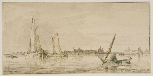 Bernhard Schreuder captured this view with pen and brush in grey and brown ink on paper. The composition is distinctly horizontal. The skyline sits low, emphasizing the breadth of the water and sky above. This spatial arrangement evokes a sense of openness and tranquility. The artist manipulates line and form to define the boats, their reflections, and the distant shoreline. Notice how the masts of the sailboats punctuate the sky, creating a visual rhythm that draws the eye across the scene. The muted palette reinforces the calm, almost melancholic mood, with subtle variations in tone suggesting depth and atmosphere. Schreuder’s approach can be seen as an exploration of space and perspective, reducing the landscape to its essential forms. The interplay between light, shadow, and the careful articulation of shapes transforms a simple scene into a study of visual structure, inviting us to reflect on the balance between representation and abstraction.