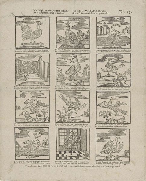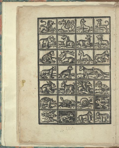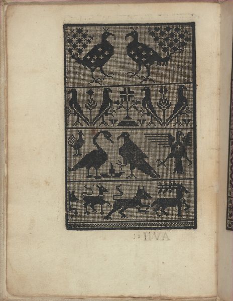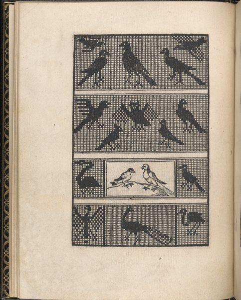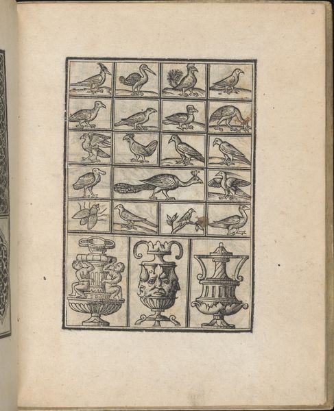 Curator: Look at this – a page from Giovanni Antonio Tagliente’s *Essempio di recammi*, created around 1530. It's a woodcut and engraving, found in one of his books. Editor: Whoa. Immediately I get this quirky, slightly unsettling feeling. It's like looking at a Renaissance bestiary through a slightly cracked lens. The birds are almost… too regular? Curator: They're stylized, yes. This wasn't meant to be ornithologically accurate. Tagliente's books were pattern books, meant for embroiderers and other artisans. These birds, vases, and figures, would be models. Editor: Ah, okay, like an early form of clip art. But even knowing that, the repetition of these forms within those rigid boxes feels almost… obsessive? Like someone trying to contain nature's chaos, with limited success. I keep being drawn to that one odd little peacock! Curator: The rigid structure was crucial. It allowed for easy transfer of the designs. Workshops would use these patterns directly onto fabric, wood, even metal. Tagliente’s work filled a demand for accessible, fashionable designs. It also speaks to the period's emerging concept of authorship and design dissemination. Editor: Fascinating. You've placed my feelings with such socio-historical understanding of it. Knowing how practical it was gives a nice understanding on why he chose these birds as inspiration. But there's still that little bit of… off-kilter charm. It is like those early naturalists drawing what they only think something may look like, not necessarily its precise depiction. I see these birds fluttering off a tapestry and flying straight into someone’s dreams! Curator: Well, perhaps the best designs do have a way of escaping their intended context. It seems that even something utilitarian can carry a certain cultural memory, even its dreams of form.