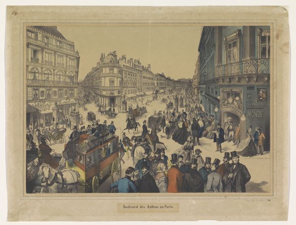 Curator: Standing before us is Alfred Dehodencq’s oil painting, "The departure of the soldiers, in July 1870," created in 1879 and currently residing in the Carnavalet Museum, Paris. Editor: What a chaotic scene. My first impression is a sort of somber tension emanating from the material handling. It feels weighty, thick. I can almost feel the texture of the fabric and the damp Parisian air just looking at the paint application. Curator: Indeed, the impasto is quite expressive, and I find that Dehodencq captures the emotional complexity of the moment with significant artistic competence. Note the chromatic restraint; the palette serves to amplify the emotional turmoil depicted. The repetition of vertical lines also conveys a palpable feeling of impending movement and mass action. Editor: For me, the material reality of 19th century conscription policies and the industrial war machine are present within those dark colors. How were those uniforms fabricated, what were the working conditions like? Also the faces of those left behind communicate anxiety of that particular time. It prompts consideration for labor involved to produce elements like textiles to be fed into war. Curator: From a purely structural perspective, the composition effectively leads the eye from the lamenting figures on the left to the soldiers marching right, with a receding cityscape subtly amplifying the painting's depth. Editor: Yes, but in doing so, he obscures a bit of the individual sacrifice by incorporating such a broad cityscape. I wonder if this painting might gain by investigating the role the factories or workshops played at that time that clothed and equipped these soldiers who were thrust into battles. What was the nature of these businesses and labor practices supporting the war machine at the time of the Franco-Prussian conflict? Curator: I agree there is certainly a dialogue to be had regarding industrial impact during conflict. Nevertheless, one cannot deny that Dehodencq skillfully encapsulates the feeling of the historical episode that resonates through this period of European conflict by examining purely compositional elements, particularly spatial relationships and figurative groupings. Editor: It really pulls me in. Dehodencq challenges what ‘history’ means through the material presence of this painting—more than any glorification, for me, the work presents a visceral reminder of labor and resources extracted to pursue wars. Curator: A provocative analysis, I'd say. Considering that it manages to invite a re-examination of semiotic language of romanticized battle in art production during the end of the 19th century.