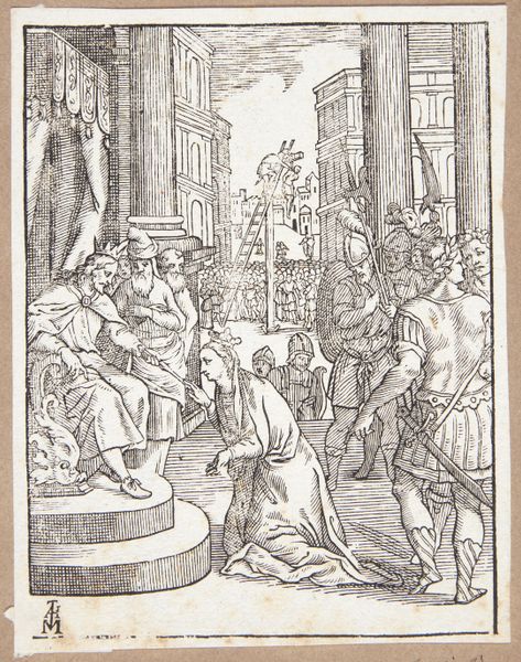 Editor: Ugo da Carpi's "Presentation in the Temple" is quite striking. The composition seems to be arranged in layers, almost like a stage. What do you see in this piece? Curator: Formally, the tonal contrasts and the interplay of light and shadow define the volumes and create a sense of depth despite the print's two-dimensionality. Observe how the artist manipulates the varying line weights to suggest texture and form. Editor: That's fascinating. It's like the figures are emerging from the shadows. Curator: Indeed. The composition relies on a delicate balance between positive and negative space, creating a dynamic visual rhythm. The gaze is invited to dance across the artwork, pausing to appreciate Carpi's mastery of chiaroscuro. Editor: I'm starting to appreciate the layers of complexity embedded within the composition. Curator: And that appreciation enriches our understanding.
