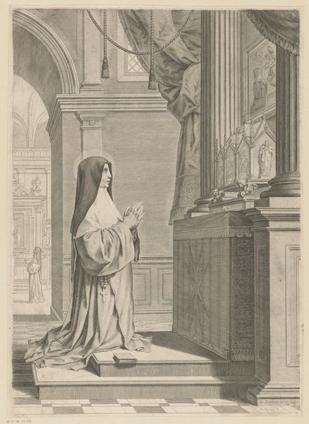Curator: This is Rose Angélique Moitte’s "Kvinde fra Bologne," or "Bourgeoise de Bologne" an etching and engraving from the 1760s. Editor: It’s fascinating! The delicate lines used to render her shawl and dress give an almost textile-like texture to the print. I wonder about the paper itself, what sort of material was common for prints like these? Curator: It's interesting to think about paper production during that time, given the cost of quality materials, printing was often subsidized by institutions, thus becoming an extension of cultural messaging. And let’s not overlook the subject. Her clothing suggests wealth and status but observe the composition within the city: How might this represent a subtle comment on class within the public sphere? Editor: Good point! One can almost feel the weight of her wool garments in the rendering, perhaps illustrating how she may feel confined by expectations or how cumbersome that societal burden can be. What was the production process like for an image like this? Curator: The etching process involved applying a wax ground to a metal plate, through which the design was drawn. The plate was then submerged in acid, etching the exposed lines. The engraving refines these lines for detail. Think of the politics inherent in that whole reproductive system; what was disseminated was carefully chosen and influenced. Editor: Right, each pull would depend on the even application of pressure, controlled wear of the matrix itself – a very material set of concerns driving the look of the finished image, I’m thinking about labor itself. Was Moitte typical as a female artist being commissioned? Curator: Less common, yes. Female artists often faced societal barriers and the pressures to conform to social standards for feminine artistry. We ought to consider what this work might represent concerning her aspirations, struggles, and reception in the public eye. Editor: It makes me consider the way we consume images even now – the physical object has receded, and yet our relationship to materiality may influence how we ascribe value. Curator: Precisely, understanding both the physical and socio-political processes allows us a fuller appreciation of the work and its significance within cultural history. Editor: Thinking about labor makes me appreciate the level of craft embedded in a print of this type. Thank you, it does lend insight into art production that encourages fresh analysis.