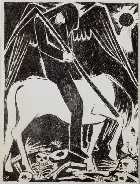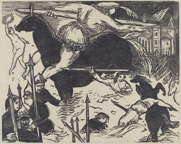 Kuzma Petrov-Vodkin created "1st of May", a monochrome artwork, during a period of significant social and political upheaval in Russia. Petrov-Vodkin navigated the complexities of artistic expression under evolving ideological constraints. This image presents a compelling allegory of hope and revolution. A winged horse, Pegasus, carries a youthful figure aloft, seemingly ascending beyond a rough, textured landscape. The stark contrast and dynamic lines evoke a sense of movement and aspiration. The figure riding Pegasus appears gender-neutral, embodying an idealized vision of youth dedicated to progress, a common symbol in revolutionary art. Petrov-Vodkin's choice to depict this scene may reflect the aspirations and emotional fervor associated with International Workers' Day, traditionally celebrated on May 1st. The artwork subtly reinforces the idea of striving towards a better future through collective effort. Its emotional power lies in the fusion of classical mythology with contemporary political ideals, inviting viewers to reflect on the enduring human quest for advancement and social transformation.