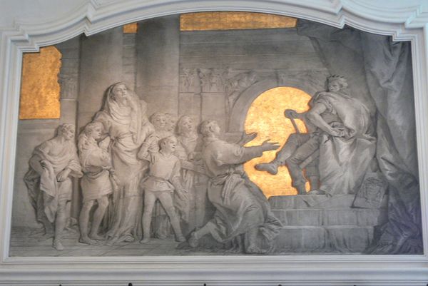 Editor: Here we have Jean Cocteau’s "Interieur chapelle Saint Blaise," a mural created in 1959 using tempera. It strikes me as a blend of ancient and modern styles, a fresco painted with strong lines, yet with somewhat haunting undertones. What do you see in this piece, particularly given Cocteau's background? Curator: Indeed. Considering Cocteau's diverse artistic pursuits, this mural within the Chapel of Saint Blaise needs to be analyzed within its historical and social context. Post-war France was rebuilding, both physically and spiritually. This work appears to draw heavily from Byzantine art, a style laden with religious and political symbolism. Look at the narrative scene; what socio-political statements do you think Cocteau might be making by depicting a spiritual, historical event in this manner for a post-war audience? Editor: I hadn’t considered that deeply, but the stark figures and narrative suggest a yearning for stability and meaning, maybe? The rawness of the lines combined with the religious theme hints at the struggles to find peace amidst devastation. Curator: Precisely. Cocteau positions art in a public space to negotiate cultural memory. This fresco becomes a site where individual suffering connects with collective history. He isn't just creating a pretty picture; he's engaging in a visual dialogue with French identity. Notice, also, how his choices for fresco, a very public form of painting, serves his larger goals of using art as an active force in cultural conversation. Editor: That’s a great point, thinking of it as less a static image and more an intervention. Understanding the setting truly reframes the whole mural! Curator: And that's how art history opens up understanding: not just in seeing the piece, but recognizing what it meant, where it was placed, and what effect it hoped to have in shaping a society.