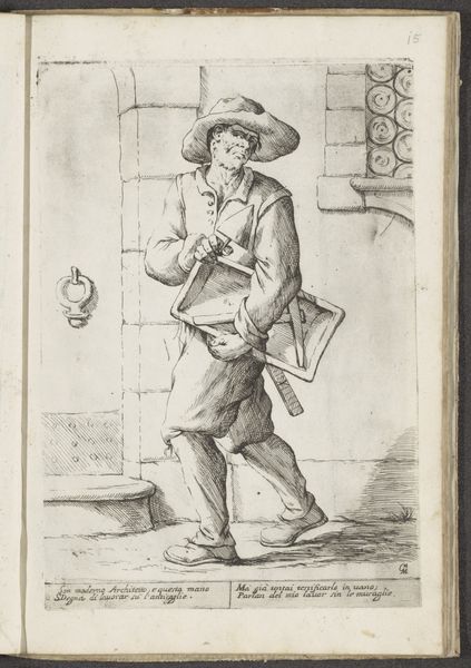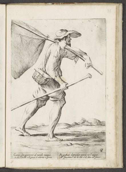This etching, Di Bologna l'Arti per via D'An.ibal' Ca.rac, was made by Giuseppe Maria Mitelli in Bologna. The artist used a metal plate, likely copper, to create this print. The image is built from a network of fine lines, describing a figure burdened by a stack of chair frames. Looking closely, we can see that the lines vary in thickness and density. This gives a sense of depth, texture and weight to the figure and the objects he carries. Mitelli expertly controlled the etching process. This involved applying acid to the plate to bite away the exposed areas, allowing him to achieve subtle tonal variations through careful labor and skillful use of materials. Prints like these offered a way to circulate images widely. The repetitive labor of printing allowed for mass production, making art more accessible. This print speaks to the social context of production. The man carrying chairs embodies a certain kind of labor. By focusing on these aspects, we can appreciate the artistry involved, and also consider the broader implications of art's creation and consumption.