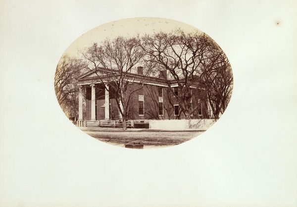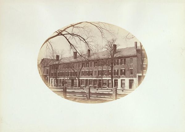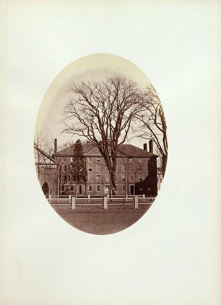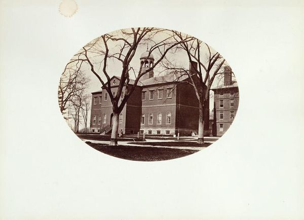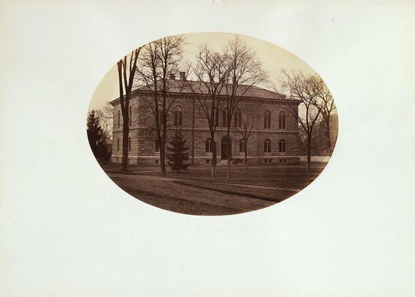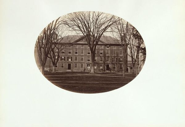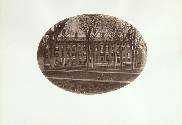 Editor: This is an interesting photograph by George Kendall Warren of Grays Hall in Harvard Yard. The bare trees in the foreground create such strong lines, almost obscuring the building. What do you see in the composition that stands out to you? Curator: The formal arrangement is striking. The photographer’s strategic placement of the central tree, its branches echoing the building's rectilinear form, demonstrates a conscious manipulation of space and shape. Note also the oval vignette, likely created in the darkroom, which further isolates the architectural subject. What function do you think the shape serves here? Editor: I guess it adds to the sense of formality, almost like a portrait. I hadn’t thought about it that way before. Curator: Precisely. It elevates the building to the level of a subject worthy of meticulous study. Editor: Thanks, I'll remember that.
