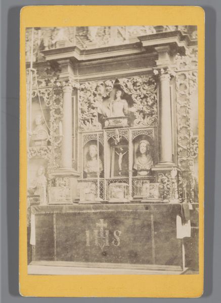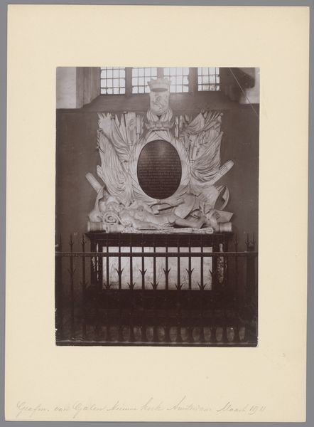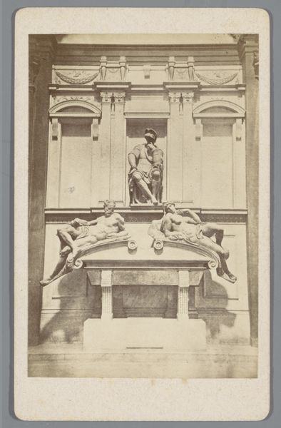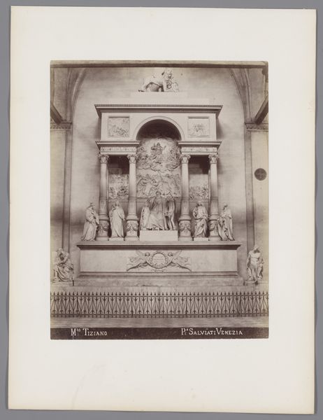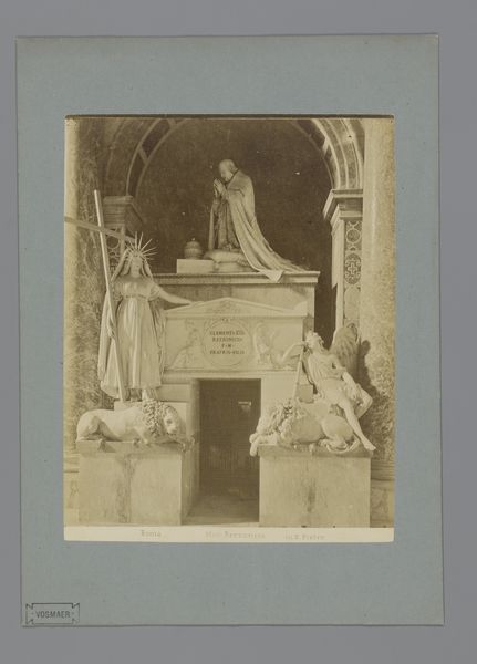 Editor: Here we have an antique photograph, dating between 1884 and 1890, titled "Grave Monument to Giuseppe Benetti in the Staglieno Cemetery in Genoa, Italy". The sepia tone lends a somber feel. What cultural narrative do you see being conveyed here? Curator: The persistent motif of the veil captures my attention immediately. Throughout history, it’s been a symbol of transition, of moving between worlds - specifically here, perhaps, between the world of the living and the realm of the dead. Editor: Interesting. I see the veiled figure mourning the loss of the deceased along with the young child. It makes me wonder, what is the function of the empty frames? Curator: That’s an excellent point. They serve as potent symbols themselves – perhaps hinting at the fragments of a life now gone, or memories fading, yet still held within the architecture of remembrance. How does the sculptural group interact with the overall architectural design in your opinion? Editor: The monument's neo-Romanesque style emphasizes the history, religion, and overall seriousness of the occasion. It encourages introspection. Curator: Precisely. In the funerary context, what we often consider is a visual representation of a family's history and collective identity, literally carved in stone, linking the generations. Editor: I had not considered the lasting memory it provided for those remaining. Now I see how the monument uses a multitude of symbols to ensure this cultural memory will be sustained for years to come. Thank you. Curator: Indeed. Examining symbols is like peeling back layers of history and understanding what holds importance and meaning across eras. It's been a pleasure to share perspectives.