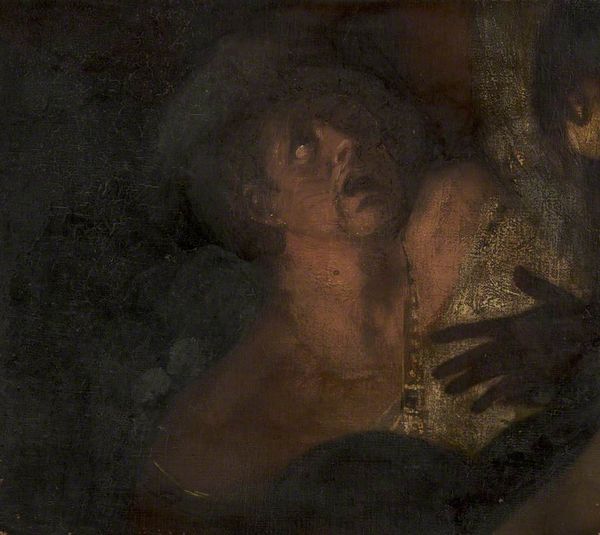 Editor: Here we have a fragment of a larger painting by George Romney titled "Alonso, King of Naples and Another Figure" presumably depicting a scene from Shakespeare's 'The Tempest.' The medium is oil paint, and you can see it's been applied in quite broad strokes. The faces are really expressive, especially with their eyes turned upward, seeming to be caught in a storm or a moment of disaster. What's your take on this? Curator: I see an intriguing study in production. The rough handling of the oil paint, especially given Romney's social standing as a leading portraitist, reveals much about the economics of artistic creation at the time. This 'fragment' points to a studio practice, a system of labor involved in producing a large history painting, intended to showcase the prowess of the British artistic scene. How much was left to the students versus to the master? Editor: That’s interesting – I hadn't considered the studio practice involved. I was focused on the emotional drama. Are you suggesting the value lies more in understanding its creation than its narrative? Curator: Absolutely. The materiality and process override a simple reading of ‘The Tempest’. Note the gestural strokes indicating not just figures but an environment – a collaborative process, a division of labor in a market economy, as opposed to the lone genius at work in his atelier, so the method shapes our comprehension. Think of what different messages these approaches project. What were you expecting of a history painting here, anyway? Editor: I suppose I was looking for a finished scene, a clear representation of the Shakespearean narrative. So by examining the materials, you see the social structure of art production within Romney's studio and more generally within British painting at that time. I wouldn't have noticed that otherwise! Curator: Precisely. We move beyond representation, interrogating the conditions of art-making itself. Considering that changes how we see it.