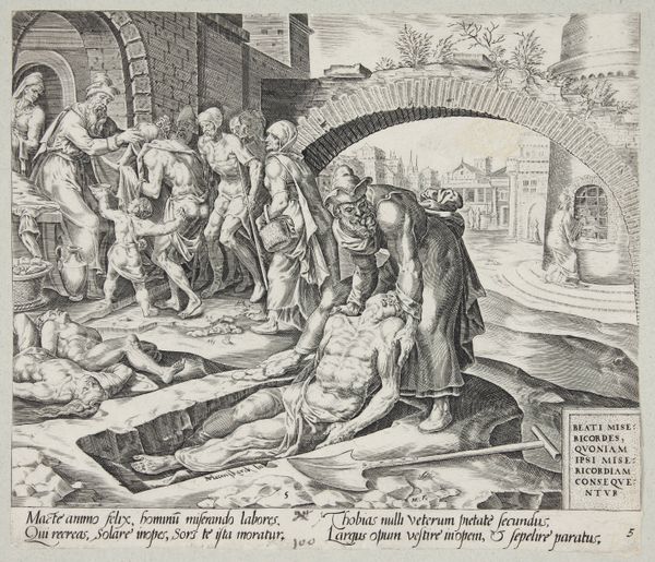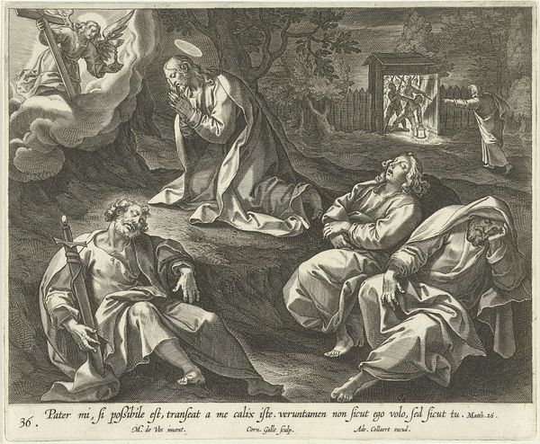 Editor: Here we have "The Adoration of the Shepherds," an engraving by Johann Sadeler I, dating sometime between 1599 and 1666. It has this deeply reverent mood. The dark lines create a strong contrast. How do you interpret this work, considering the historical context? Curator: It’s fascinating to view this through the lens of its time. This print emerges in the wake of the Reformation and Counter-Reformation. How do you think that religious upheaval shaped artistic choices, particularly the portrayal of figures and the narrative? Editor: Well, I see the shepherds, they're humble and reverent, maybe relatable to the common person, emphasizing direct access to faith instead of hierarchical religious structures? Curator: Exactly. Sadeler's "Adoration" isn't just a religious scene; it's a socio-political statement. The shepherds, representing the marginalized, are central. Do you notice anything about the space they occupy in relation to the holy family? Editor: They seem to be given the same importance, maybe even more, filling up much of the composition. It’s almost… populist. Curator: Precisely! This challenges the elite's exclusive access to the divine. This work becomes a powerful articulation of faith, accessible and belonging to everyone. And the animals, in a more radical reading, suggest humans aren't as cognitively advanced as they suppose. Editor: I hadn't considered that perspective before, of art as a tool for shifting social dynamics. Thank you. Curator: And thank you. It’s through these dialogues that we can unearth the multi-layered meanings within a work like this.