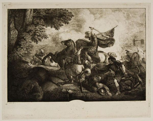 Curator: We’re looking at "Strijdgewoel," an etching by Antoine de Marcenay de Ghuy, created in 1755. Editor: It’s a tumultuous scene. Chaos rendered in stark monochrome; I immediately notice how the artist directs our gaze through converging diagonal lines, amplifying the feeling of conflict and frenzy. Curator: Absolutely. The artwork depicts a scene of historical battle, and one reading could place the etching within broader narratives of conflict during the mid-18th century—a period marked by increasing tensions and wars, not just between European powers but in the colonies as well. De Ghuy may well have been alluding to contemporary anxieties. Editor: Or perhaps referencing past upheavals. Consider the composition itself. The clustered figures and swirling movement echo the Baroque aesthetic, a style characterized by its dramatic intensity and dynamic energy. See how de Ghuy employs hatching and cross-hatching techniques to create areas of deep shadow, thereby heightening the drama. Curator: Speaking of drama, there's the clear suggestion of the narratives surrounding leadership and masculinity at the time. The central figure atop the horse is wielding a flag, representing perhaps, a distorted sense of patriotic duty that contributed to this type of violence. Who benefits, really? Editor: A visual feast, it’s almost overwhelming in its density. The details—the musculature of the horses, the fallen soldiers, the fluttering flag—all contribute to a scene charged with intense energy. The artist compels us to confront the physicality of battle. Curator: But is it really a heroic scene, or an indictment? If we think about the ethics of warfare and the representation of human suffering at this moment in time...it compels questions that resonate deeply. Editor: Perhaps both? It seems de Ghuy allows us to become absorbed by the maelstrom of artistic virtuosity, and historical narrative. I admire the dynamic visual complexity of it all. Curator: I agree, and I leave considering how warfare’s persistent visibility reflects our shared historical trajectories.