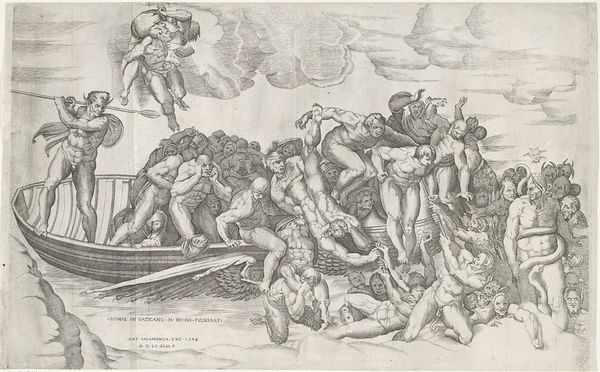 Giorgio Ghisi made this print, "The Last Judgement, Sheet B," in the 16th century. The image captures a period marked by religious fervor and the looming shadow of the Inquisition, as the Catholic Church sought to reinforce its authority. Ghisi, working within the rigid norms of his era, presents a scene steeped in religious doctrine and judgment. However, the artwork prompts us to think about the power structures inherent in such narratives. The muscular, predominantly male figures, emphasize a certain ideal of humanity, excluding other bodies and experiences. Consider the emotional weight of eternal judgment, especially for those who lived during a time of intense religious persecution. This print, while seemingly traditional in its subject matter, also reflects the societal anxieties of its time. It serves as a reminder of the ways in which art can perpetuate and challenge the status quo, inviting us to reflect on our own roles within these complex narratives.