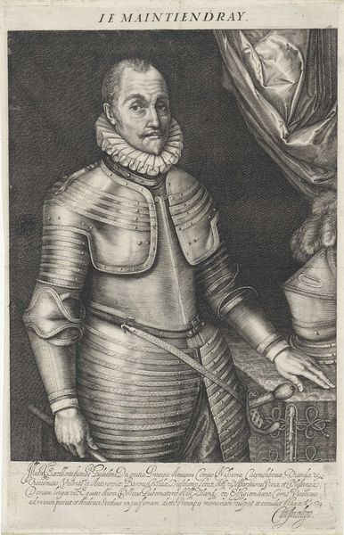 This is Simon van de Passe’s print of Lamoraal, Count of Egmont, made in the early 17th century. It's an engraving, meaning the image was incised into a metal plate, probably copper. The process begins with covering a metal plate with a waxy, acid-resistant coating. The artist then scratches away the coating with a sharp tool, exposing the metal underneath. When the plate is dipped in acid, the acid bites into the exposed lines, creating grooves. The deeper the grooves, the more ink they hold, and the darker they appear in the final print. The sharp lines of the engraving lend themselves well to capturing the Count’s status; look at the details of his elaborate costume, the crisp rendering of his armor, and the carefully delineated background scene. These details speak to the social and political context in which the work was made; printmaking allowed for the widespread dissemination of images, playing a crucial role in shaping public perception of important figures like Egmont, who was executed for treason. The print is not just a portrait, it's a carefully crafted statement about power, rebellion, and the rapidly changing world of early modern Europe.