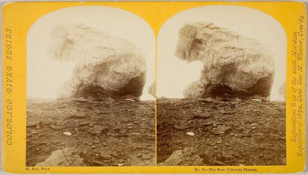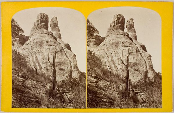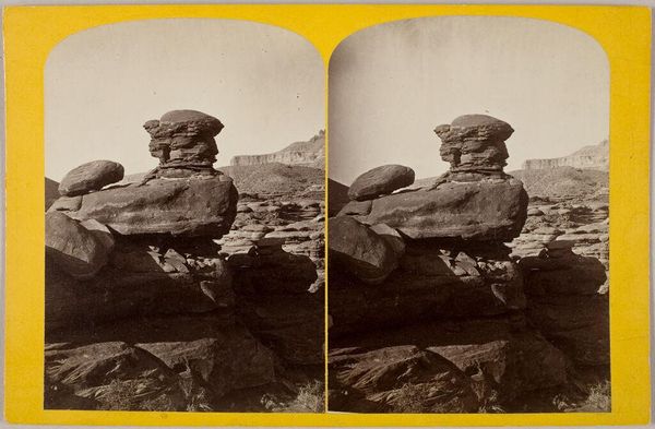 Curator: Let's turn our attention to William Bell's "Sand Sculpture," a stereograph from the Harvard Art Museums collection. Immediately, the image feels…monumental, in a strange way. Editor: Yes, the stereoscopic format almost tricks the eye. You're confronted with this substantial rock formation, topped incongruously with what looks like a bowler hat. Curator: Bell worked as a photographer for geographical surveys, and this image, likely from 1872, documents those expeditions. Consider the labor involved in transporting equipment to remote locations. Editor: It also speaks to something deeper, I think. The hat, so deliberately placed, becomes a symbol. Is it claiming the landscape, mocking its grandeur, or simply a playful human touch against geologic time? Curator: Or perhaps it simply suggests human scale against the overwhelming natural landscape? The very act of photographing and distributing these images makes the landscape accessible. Editor: Maybe, but that little hat steals the show for me. It makes me smile, and then it makes me think. Curator: It certainly draws the eye. I think Bell's work is invaluable for the window it provides into the intersection of art, science, and exploration in the 19th century. Editor: Absolutely. And even now, there’s something utterly compelling about these little windows into the past.