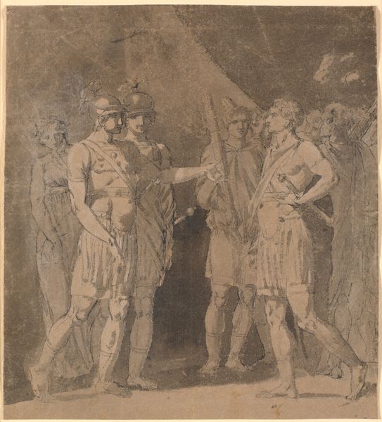 Editor: Here we have Nicolai Abildgaard's "Scene fra Voltaires 'Le triumvirat', formodentlig 2.akt., 2.scene," a pencil drawing made between 1798 and 1801. I'm struck by the starkness of it, the sort of dramatic lighting, and the very theatrical poses of the figures. What's your read on it? Curator: Oh, this one! It whispers stories of revolution, doesn't it? Abildgaard, flirting with Neoclassicism, translates Voltaire's drama into stark lines and suggestive shadows. Do you sense the tension crackling? Editor: Absolutely, it's palpable. Is it meant to reflect a specific political climate, maybe the French Revolution and its aftermath? Curator: Precisely! The play itself, hinting at power struggles and the corrupting nature of ambition. And Abildgaard, a clever egg, uses that setting to reflect the turbulence in Denmark during that time. But notice how he distills the drama—almost like a stage set waiting for the players. Makes you wonder what dialogue is about to explode, right? Editor: It really does. And the female figure at the right, gazing upwards—what is she looking at? Hope, or resignation? Curator: Aha! Now you're getting at the heart of it. Is it blind faith, perhaps? Or maybe a challenge to fate? She is illuminated differently than the rest. Abildgaard likes riddles wrapped in pretty pictures, I suspect. These neoclassicists used dramatic presentation to mask all types of symbolic language to get around authority. Tricky folks! Editor: It is rather fascinating. Thanks. It really adds layers to how I see it, and how relevant art can be, even when tackling narratives from centuries ago. Curator: Exactly. And remember: it’s the questions the art provokes, the conversations it starts, that truly bring it alive. Even now. Perhaps now more than ever, eh?