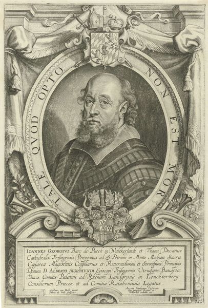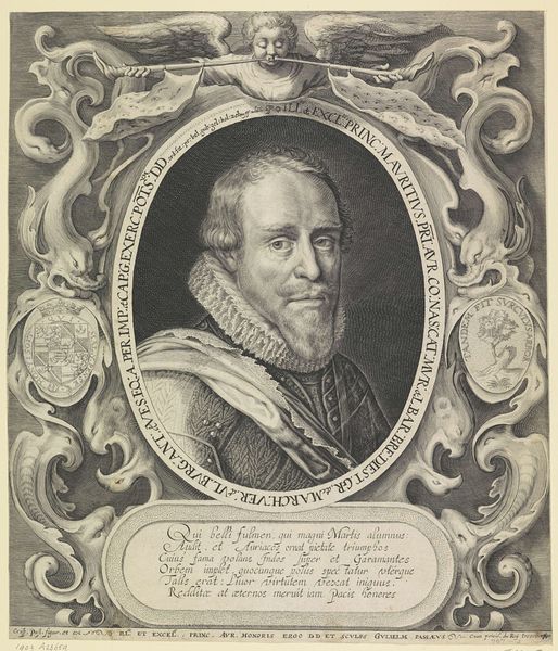 This is an engraving of Maurits, Prince of Orange, made by an anonymous artist. The portrait presents Maurits in armor, framed by laurel leaves and inscriptions denoting his titles. Consider the historical weight of this image. Maurits, as a leader in the Dutch Revolt against Spanish rule, was a key figure in the formation of the Dutch Republic. This portrait, therefore, isn't just a likeness; it's a carefully constructed representation of power and authority, made to bolster the Dutch national identity. We should think about the cultural norms of portraiture at the time. How did images of leaders reinforce social hierarchies? Whose stories were being told, and whose were being left out? This image performs an important function - to remind the Dutch people of their leader, and to inspire them to remain independent.