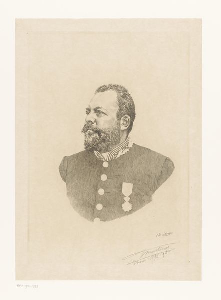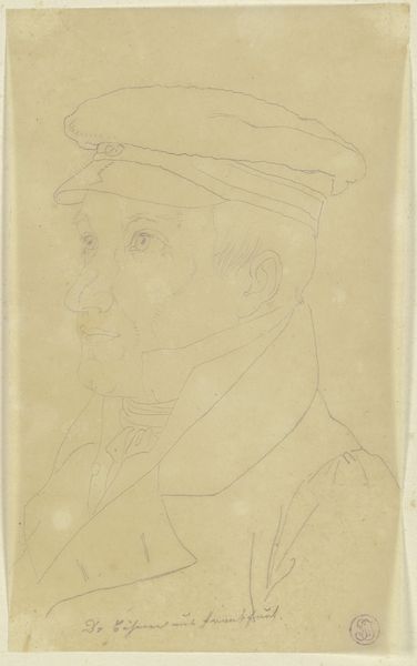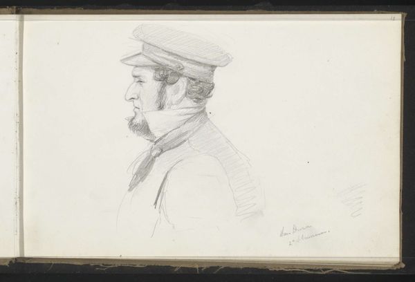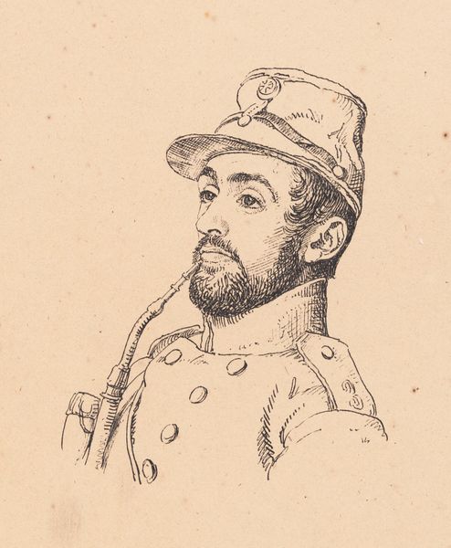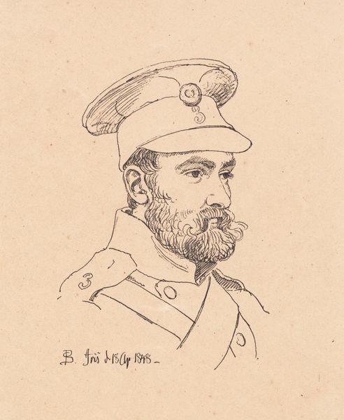 Curator: Welcome. We're looking at a portrait drawing entitled "J. Th. Lundbye" by P.C. Skovgaard, created in 1848. It’s held at the SMK, the National Gallery of Denmark. It appears to be primarily pen, with pencil sketches present. Editor: Immediately, there's a quiet, almost melancholy air to it. The cross-hatching is minimal yet deliberate, creating shadows that lend a subtle weight to the figure's expression and overall military dress. Curator: Skovgaard’s use of line is very efficient. Observe the varied line weights: thinner, delicate strokes suggesting the softer textures of the skin and beard against bolder outlines defining the military uniform and cap. There’s a clear academic focus, but not devoid of realism. Editor: I wonder about the political context. It was created in 1848, a year of revolutions across Europe. How does portraying Lundbye in uniform speak to Danish identity at a time when nationalism and militarism were so potent? Was he going off to war? The subtle downcast expression on his face almost feels as if it suggests that Lundbye isn’t celebrating that moment in history. Curator: The portrait exhibits qualities of Realism through precise rendering and objective representation but lacks any overtly sentimental or romanticized qualities. We are presented with an unaffected likeness. Editor: Yes, but affect is still there! Consider the date written near the bottom; the careful inscription of his name alongside ‘1848.’ Does the slight awkwardness in his uniform point towards feelings of political and social tension. He certainly seems a man in service—the uniform a representation of his life in a changing Denmark. The piece offers a restrained emotionality but does it ask questions regarding the man's individual existence during conflict? Curator: Perhaps. To reduce the reading to merely this sociopolitical moment is to discount Skovgaard’s emphasis on the portrait itself as an artwork of study and skill. To separate itself from any external readings and ask simply; does it present a unified composition? It certainly manages an efficient display of technical competence, yet its success rests ultimately upon representational technique. Editor: It’s that tension that interests me. We are witnessing Skovgaard engaging with notions of identity in a politically heated environment, using art both as a medium for technical study, and sociopolitical reflection. I am pleased that it provokes us to keep that tension alive today. Curator: Indeed, thank you for that contribution, I am in slight agreement and hope our listeners are able to glean some thought regarding the artist's process within their own analyses.