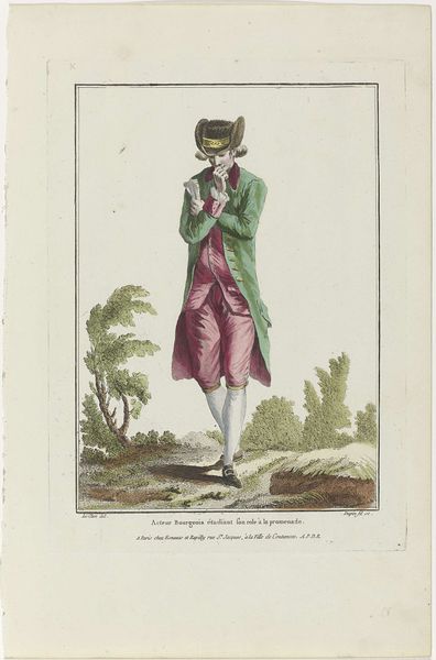 Curator: This watercolour illustration and print, made in 1803, is titled "The Inexpressible Air of Dignity, –the Incomprehensible je-ne-sais Quoi of Elegance, which Appertains Solely to Men of High Fashion"–Vide, Lord Chesterfield's Letters", and it is the work of James Gillray. What are your initial thoughts? Editor: My first impression is sharp wit and irony. The exaggerated silhouette just oozes with what I can only call perceived self-importance. There is such satire in the posture, the colors... a delicate mockery. Curator: Indeed. Gillray was the master of satire. It’s interesting how he uses the print medium to challenge aristocratic pretensions during the late Georgian period. I read it as an excoriating commentary on the shallowness of high society, amplified by the artist’s dedication to exaggerated visual language. Editor: The subject looks both proud and utterly ridiculous, right? Note the tiny head perched atop the excessively padded shoulders, emphasized by the angle of the jawline... almost birdlike. There is such a meticulous absurdity in those details. Curator: Exactly. He seizes upon the romantic aesthetic as a launchpad for merciless observation. His manipulation of line and colour, within what may seem conventional at first glance, subtly underscores social commentary through emphasis and distortion. Editor: Let’s face it, "elegance" at that time was more a matter of affectation. This piece almost anticipates post-structuralist critique with its play on surfaces, right? Do those "high fashion" characteristics even contain deeper meaning or hold real substance? Curator: An astute point! The use of caricature directs our perception and expectations towards meaning by contrasting those surfaces against implicit ideals of dignity and genuine accomplishment, questioning societal constructs. The question becomes... does society grant dignity merely through elegant appearances? Editor: Exactly. Elegance then seems an empty signifier. Gillray has successfully created an image that makes us ponder on something so...frivolous. I almost pity the poor overdressed man. Almost. Curator: Perhaps there is a bit of melancholy in it. A touch of our own ridiculousness? A reminder that even in the relentless pursuit of external appearances we risk being trapped by their shallowness.