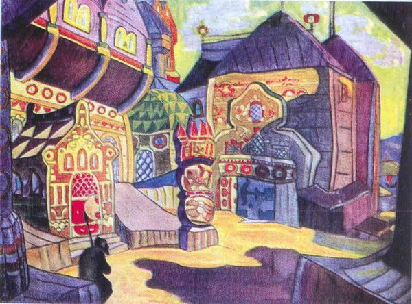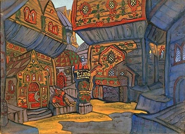 This is "The court of Prince Vladimir Galitsky (Study of scene design for "Prince Igor")" by Nicholas Roerich, but the date it was made is unknown, and the medium is also unknown. This piece is so cool. The loose, confident way the scene is blocked out reminds me of set design. It’s all about capturing the overall mood and feel, rather than getting bogged down in the details. I love the way Roerich uses color here, too. It's not about realism, but about creating a sense of atmosphere and drama. The texture is great as well. Up close, you can see how the layers of paint are built up, creating this amazing, almost tactile surface. But then, from a distance, it all blends together to create this really rich, immersive experience. Look at the way the light catches those little strokes and dabs of paint. It's like he's trying to capture the essence of a fleeting moment, a memory, or a dream. Roerich was a theosophist and spiritual seeker and the influence of artists like Gauguin and Kandinsky is evident in this piece. Like them, he's searching for something beyond the surface of things, exploring the hidden depths of the human psyche.