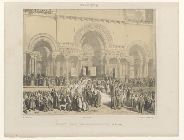 Caspar Jacobsz. Philips' print from 1786 depicts the Genootschap Pro Patria in the Nieuwe Kerk, rendered with precise lines in monochromatic tones. The symmetrical composition, anchored by the church's soaring Gothic arches and columns, creates a receding perspective that draws the eye into the crowded scene. This calculated use of space emphasizes the structural grandeur of the church against the detailed assembly of figures. Philips contrasts the rigid, vertical lines of the architecture with the softer, more organic forms of the people. Note how the artist uses linear perspective to direct attention and structure the space, yet this also hints at broader social and political orders. The print can be understood through semiotics, with the architectural setting symbolizing established power, and the assembly suggesting emerging social dynamics. In this way, Philips does more than represent a historical moment, but rather engages with contemporary ideas around citizenship and collective identity.