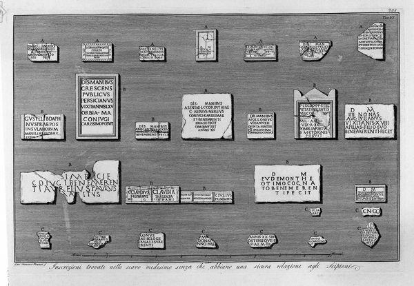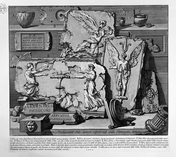 Editor: Here we have Giovanni Battista Piranesi’s print, "The Roman antiquities, t. 2, Plate XII. Prospectus and Profile of a tomb of the previous rooms", created in 1756. The stark black and white and architectural rendering give it a detached, almost clinical feel, despite depicting a tomb. What symbolic weight do you see within these carefully delineated lines? Curator: The print presents us with a vision of Roman grandeur, fragmented and decaying. Note how Piranesi meticulously documents the stucco ornamentation. These aren’t just decorative elements, but carriers of cultural memory. Do you notice how the recurring motifs—the mythical creatures, the geometric patterns—echo across the different panels? Editor: Yes, the winged creatures and diamond shapes seem intentionally placed, almost like a coded language. Curator: Exactly. Think of these images as fragments of a lost narrative, symbols chosen to resonate with the deceased and perhaps guide them in the afterlife. The arch, for instance, is a powerful symbol of transition and passage, both physical and spiritual. What do you make of its state of ruin? Editor: It speaks to the inevitable decay of even the grandest structures, a reminder of mortality. Curator: Indeed. Piranesi isn’t simply documenting; he's also engaging in a dialogue with the past, acknowledging both its magnificence and its fragility. It is almost a memento mori itself. Editor: That's a very poignant observation. I see it in a completely new light now. Curator: These visual remnants offer a powerful connection to ancient beliefs, preserved, even celebrated in the face of decay.