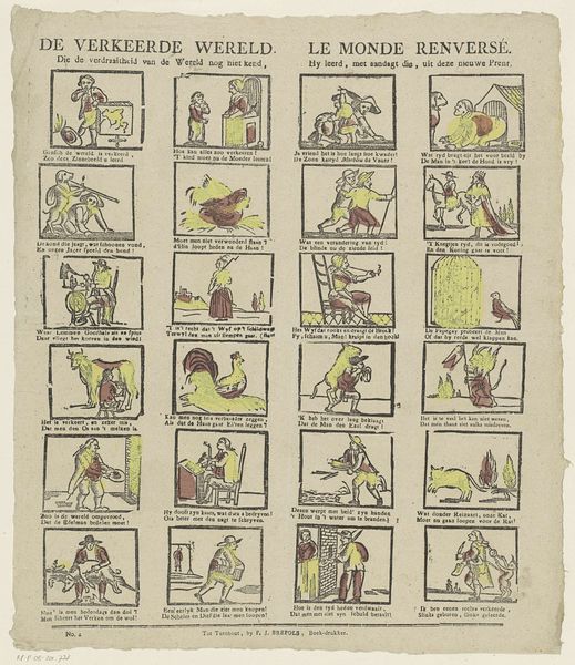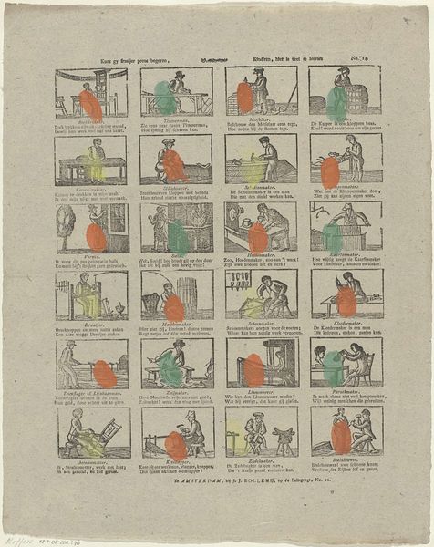 This print, titled "Here you have the life and business of Jan de Wasser and his wife", was made by Erven de Weduwe Jacobus van Egmont. It's printed on paper, using an intaglio technique, where the image is etched or engraved into a metal plate, then inked and pressed onto the page. Look closely and you'll notice the linear quality, a direct result of the incised lines. The relatively light and thin paper would have been widely available and affordable. The image, composed of small vignettes, tells a story – likely about the everyday lives of working people. The act of printing itself implies a certain level of industrialization, a move toward mass production and distribution of images to a wider audience. Consider the social context: prints like this one would have played a role in shaping public opinion, documenting everyday life, or even satirizing social norms. The relatively accessible medium of print democratizes art, moving it away from unique, handcrafted objects, and into the realm of mass communication and collective experience.