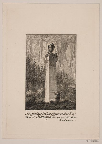 Frederik Ludvig Bradt created this print of 'Forblommet antik i Fredensborg Have'. It gives us a glimpse into the aesthetic and cultural values of the late 18th century. The print depicts an idealized vision of nature and classicism. It reflects the period's fascination with antiquity, seen here in the form of a monument adorned with classical busts, set within a romanticized natural landscape. There's a sense of serenity, yet also a constructed formality. Consider how landscapes like these were designed as spaces of leisure and contemplation for the elite. The figures in the foreground, seemingly carefree, underscore the social dimensions of such environments. The artist invites us to consider how nature itself can be sculpted to reflect societal ideals and power structures. How do these curated spaces uphold certain social narratives? The work is more than just a pretty picture. It's a cultural artifact that reveals the complex interplay between nature, art, and social identity during the late 1700s.