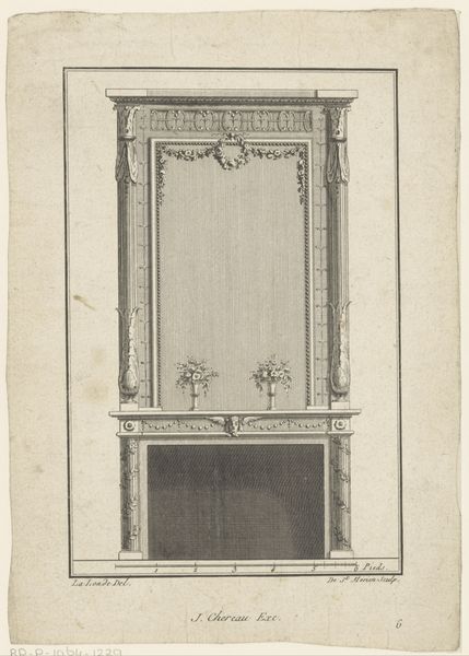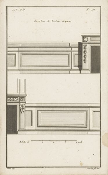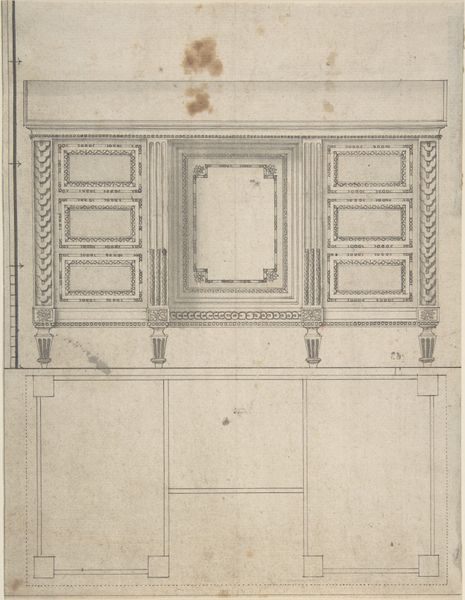 Curator: Immediately, my eye is drawn to the absolute precision. It's like an architectural drawing shrunk down. Editor: This print, held here at The Metropolitan Museum of Art, is titled "Design for a Chest of Drawers," and it originates from the 18th century. It’s a great example of Neoclassical style in furniture design. Curator: I can see that! The geometric rigor, the insistence on symmetry—it's so cool and rational. It’s a visual manifesto of order. Editor: Note, for instance, how the patterns around the drawer openings mirror each other in semi-circular arcs. The rectangular panel to the right offers stark contrast and balance. Do you notice, Iconographer, the symbolism inherent in those repeated circular motifs? Curator: Of course! The circle has always been laden with meaning. It evokes cycles, eternity, wholeness… paired with those rigid rectangles, there’s a tension, a dialogue between the eternal and the temporal, or between nature and structure, perhaps? Editor: That reading has real weight. The materials, or at least the suggestion of materials through these printed lines, play into this too. The grain of wood—the sense of touch implied—against the cold, hard lines of the structure. Semiotically, that’s fascinating. Curator: Precisely! And let's not forget the psychological dimension. Furniture designs like this reflect not just taste but also societal values—a yearning for permanence, for stability, particularly significant after the stylistic indulgences of the Rococo era. Editor: Yes, this is clearly meant to express values of temperance. It stands almost as a rebuke to excess, its very design suggesting restraint. Curator: The more I study the detail— the repeating decorative borders!— the more the chest whispers stories of lives lived around it, of precious things carefully stored, of order imposed on the chaos of existence. Editor: The details provide depth here; from a formal standpoint, there’s great attention given to positive and negative space to generate a visual balance. Curator: Thank you, now I see new aspects of this furniture design! Editor: Of course, together our appreciation is amplified.