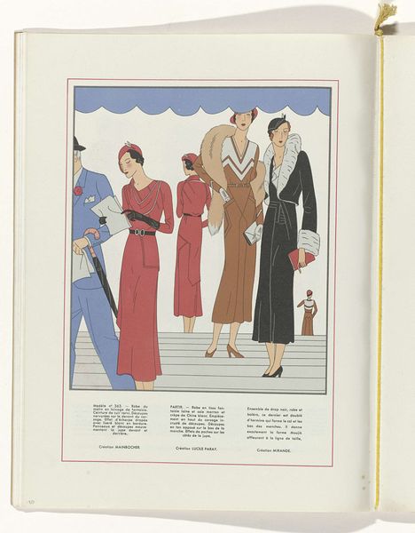 Editor: This print from 1932, "Art - Goût - Beauté", showcases women's fashion, seemingly from an elegance magazine. There's a delightful stillness to it, yet the patterns and colours pop, making it feel both classic and modern. What do you see in this piece? Curator: The Art Deco era was fascinated with conveying the modernity of women's status, and this drawing captures that ambition perfectly. It is interesting how the dresses are less about function, and more about a bold representation. What do you think the cactus plants framing the characters could symbolise? Editor: Hmmm, perhaps a link to exotic travels? Or even resilience and adaptability, something associated with the modern woman? Curator: Indeed! Cacti, symbols of endurance and also emblems of the 'New World', bring in an element of the adventurous spirit, but it's fascinating how even in a commercial illustration such as this, there is still symbolism deeply rooted within the fashion on display. Editor: I never considered fashion plates could be so rich with cultural context. Thanks, this insight makes me appreciate this artwork even more. Curator: It highlights the continuous exchange between art and cultural values, which enriches even the most seemingly simple images.