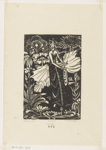 Curator: Looking at Bernard Essers' woodcut from 1927, "Pijnboomen (Bretonsche baai bij eb)," the first thing I feel is…peace. A stark, graphic peace, but still a quiet stillness. Editor: It strikes me as less peaceful and more controlled. The graphic quality you mentioned – the high contrast, the precise lines of the woodcut medium – those aren’t accidents. Essers chose this medium. Curator: Ah, but control can lead to peace, no? Think of gardening, the controlled chaos that results in… tranquility. Look at the geometry, for example. Everything aligns, creating rhythm through repetition, echoed across the water… It is a composition striving to connect nature with abstraction. Editor: Rhythm certainly. I mean, those precise lines carving out trees and rocks, they demonstrate skilled labor, wouldn’t you say? How long must it have taken to carve out so much fine detail? Essers has transformed a block of wood – an object of practical use—into something sublime. Curator: Absolutely! He understands his materials. This wasn't a happy accident; Essers felt something here. It speaks, to me at least, to this ineffable relationship, the give and take, between the land and sea. The almost brutally stylized rendering of nature doesn’t detract, but actually adds to the work’s…mystery. Editor: What fascinates me, too, is how the material limitations themselves can define the entire aesthetic. Each groove painstakingly chiseled from the block dictates form, and defines the image—creating shadows and light by what is removed, not what is applied. It shows the beauty and potential residing in the materials and method itself. Curator: So we're agreed, in the end, despite coming from very different perspectives! The print speaks to a human interaction, be it controlled labour, or our endless artistic dance, and desire to capture that great unknown outside. Editor: Yes. Both are vital readings. After all, art invites many perspectives, reflecting both its creation and interpretation.