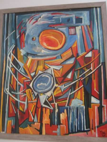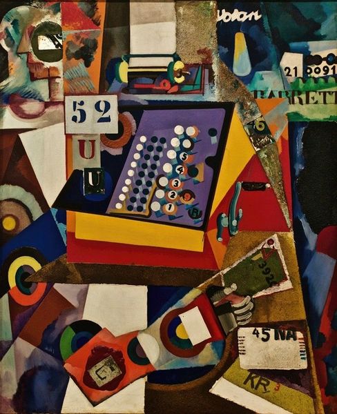 Curator: At first glance, "Heavy Red" almost feels like an underwater world—maybe coral reefs rendered in dreams. Editor: Yes, Kandinsky certainly invites that sort of imaginative leap. This work from 1924, in oil paint, represents his mature embrace of geometric abstraction during his time teaching at the Bauhaus. Curator: I love the audacity of it all! Kandinsky just throws shapes and colors at you. The red field pulses with life, a foundation for playful spheres and stricter geometric forms. There's this chaotic energy, like musical notes scattered across a score. Editor: It’s controlled chaos, though, isn't it? The composition is carefully balanced. Think about the weight of that blue triangle in the bottom left against the large yellow section to the right. This visual push-and-pull echoes the artistic tensions of the era as artists explored utopian social forms and the pure language of shapes after the devastation of World War One. Curator: Utopian perhaps, but tinged with melancholy. Those fine black lines—do they tether the buoyant shapes or imprison them? It's not all sweetness, light, and Bauhaus idealism. There's a depth, an undercurrent of seriousness, maybe even longing. I mean, what exactly IS that tower-like structure in the lower left? A city? A ruin? A memory? Editor: And those floating orbs! Like cosmic bodies. Kandinsky's interest in the spiritual is clearly visible. He explores synesthesia, believing colour deeply influences the soul. He brings cosmic theories from his perspective as someone deeply embroiled in post WWI political theories and ideologies of progress through material changes. It really echoes a society’s desire for profound change on every level of reality. Curator: It all blends into a complex symphony of meaning, and still... the red is the showstopper for me. The painting is a portal into Kandinsky’s very unique, very vibrant world. I never feel neutral standing in front of one of his paintings, that's the power it holds! Editor: A world we can still explore and debate about the role of utopian imaginings! A world where abstraction pushes at the boundaries of experience.