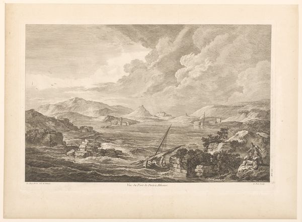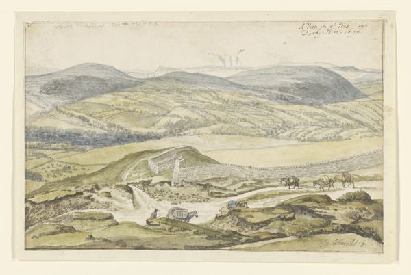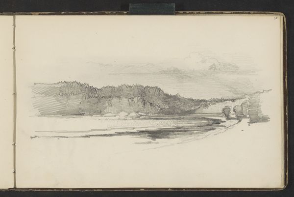 Editor: This drawing, "Landschap met veldslag" or "Landscape with Battle" by Alexandre-Gabriel Decamps, was created in 1833. It's a graphite drawing, and the details are quite striking given the medium. It almost feels cinematic, but also claustrophobic because the sky is heavy and dark. What are your initial thoughts on this work? Curator: Immediately, I’m drawn to the interplay of light and shadow and its effects on the atmospheric depth within the piece. Decamps utilizes the graphite to create stark contrasts, guiding the viewer’s eye from the light-filled horizon down to the darkened foreground where the conflict appears to be unfolding. The hatching and cross-hatching are quite strategic, adding volume to the landscape features and lending a dramatic quality to the scene. Observe how the composition divides into distinct horizontal zones – sky, distant land, and the immediate battleground, which is the focal point. How does this structured approach to composition influence your understanding of the work? Editor: I think the division creates a sense of scale and distance, almost like watching a scene unfold on a grand stage. It makes me focus on the details of the foreground but still consider it within a much larger context. It does create visual harmony, too! Curator: Precisely. The texture plays a crucial role as well. Notice how Decamps uses rough, broken lines in the foreground, which evoke a sense of chaos and disarray, whereas smoother, blended tones are used in the background to suggest tranquility. Editor: Now that you point it out, the contrasting texture emphasizes the central conflict and amplifies the overall dramatic mood! I was drawn to the emotional feel and landscape elements at first glance. However, breaking down the composition using visual cues allowed me to understand better Decamps’ technical and visual decision-making. Curator: Agreed. That tension underscores Decamps' intention in composing the artwork! It highlights the significance of even the smallest details in building a complete image.
