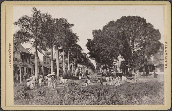 Editor: This is a photograph from 1912 by Onnes Kurkdjian titled "Mannen met aapjes op een erf aan een water, mogelijk in Surabaya" – "Men with monkeys in a yard by a water, possibly in Surabaya". It’s captivating – the way the light and shadows play across the scene. What visual elements stand out to you the most in this piece? Curator: Immediately, the stark contrast of light and dark segments the composition into distinct planes, drawing attention to the interplay between the architectural form and natural elements. The building’s colonnade creates a rhythmic division of space, countered by the organic asymmetry of the tree roots on the right. Observe how the photographer manipulates tonality to sculpt the forms, particularly the tree trunk. Editor: Yes, the tree is a very striking element. What can you tell me about its structural relationship within the picture? Curator: It serves as both a repoussoir, guiding our gaze into the scene, and a framing device, containing the activity within. The tree's strong verticality contrasts with the horizontal emphasis of the building, thereby establishing a dynamic visual tension. Semiotically, the root system speaks to the groundedness of the scene. What do you make of the monkey distribution? Editor: It's intriguing. They’re scattered around but still clearly defined in relation to the human figures. Curator: Precisely. This strategic placement ensures they aren't mere embellishments but integral actors in the composition's narrative structure. It creates a tableau vivant with an exquisite contrast between architectural backdrop, humanity and animal vitality. A formal conversation between man and nature in a photograph that goes beyond narrative. Editor: That makes perfect sense. Thank you. I appreciate you taking the time to explore this image with me, especially thinking about the compositional balance and visual hierarchy. Curator: It has been a pleasure discussing the artwork from a formal perspective. I find I appreciate the picture more from our exchange.
