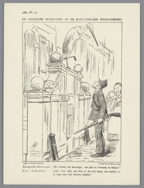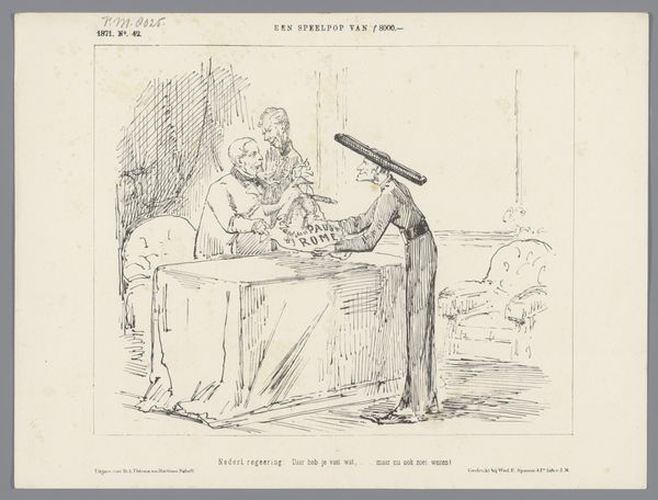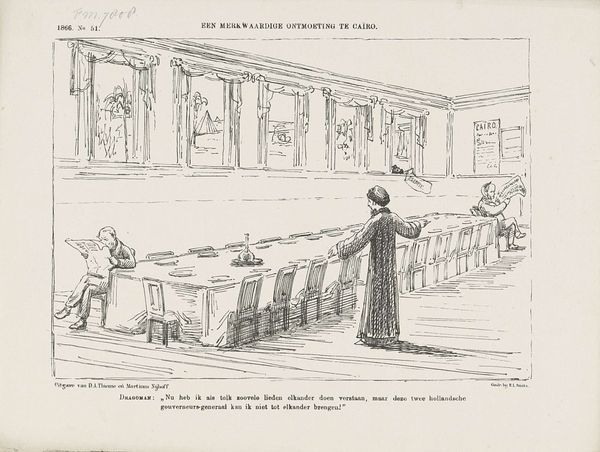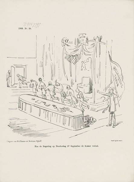 Johan Michaël Schmidt Crans created this print in 1869, and it offers a satirical glimpse into Dutch parliamentary politics during a period of significant social and political change. The cartoon depicts members of the First Chamber meticulously scrutinizing the text of the Speech from the Throne, a key moment in Dutch politics where the monarch outlines the government's policies for the coming year. The artist cleverly portrays this process as an "anatomy," dissecting the speech word by word, revealing the power dynamics at play. The lone figure gazing into the chamber suggests a sense of alienation or perhaps a critical outsider observing the political machinations. The text below the cartoon reads "They sit weighing every word... and I--I completely lost my mind!!!" expresses frustration with the political process. Schmidt Crans uses humor to comment on the meticulous, sometimes absurd, nature of political discourse. The cartoon thus not only reflects a specific historical moment but also resonates with broader questions about the nature of representation, power, and the role of the individual within a larger political system.