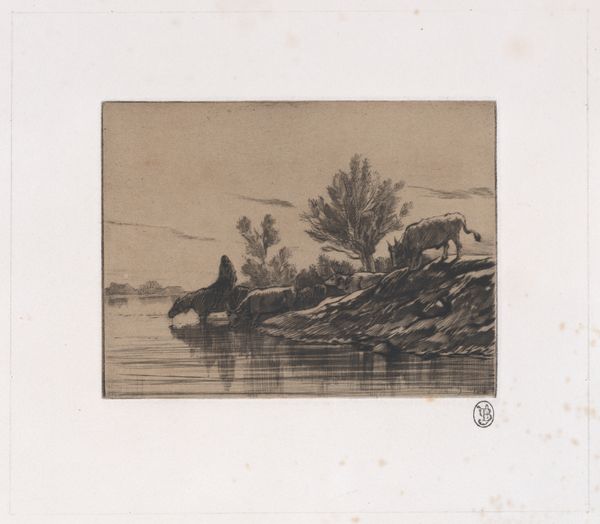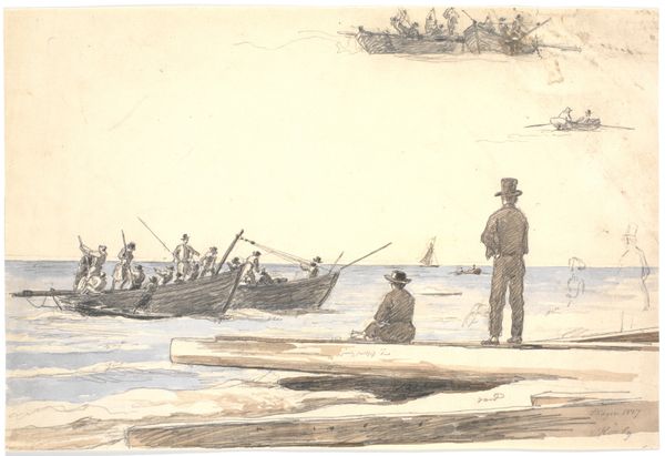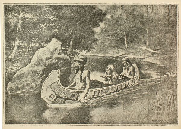 Editor: Frederic Remington's 1889 charcoal drawing, "Pitched It Sheer into the River . . . Where It Still Is Seen in the Summer," features three figures in a canoe. It evokes a sense of serenity and mystery. The monochromatic palette is particularly striking, focusing on gradations of light and shadow to create depth. What can you tell me about its composition? Curator: Note how Remington uses a limited tonal range to unify the composition. The charcoal medium, expertly manipulated, yields an interplay between texture and form. Observe the sharp contrast outlining the canoe and figures versus the soft atmospheric treatment of the landscape. It almost forms a series of interlocking planes of contrasting dark and light, doesn't it? How do these contrasts direct your eye? Editor: They guide my eye to the canoe and its occupants, especially the figure in the front. It emphasizes their presence within this vast, softly rendered landscape. Are you suggesting the limited tonal range reinforces their solidness against the ethereal landscape? Curator: Precisely. Consider also how the artist directs the lines to a focal point near the front figure, further emphasizing perspective, while texture and form create a narrative using contrasts to guide our sight across the work. What of the symbolic meaning that comes through formal reading? Editor: It seems Remington is focusing on the formal elements – line, tone, contrast – to convey a sense of place and presence. The lack of color directs the viewer towards form and texture to create deeper meaning. It seems less like storytelling and more like building blocks. I find this fascinating! Curator: Indeed, we can appreciate the technique beyond the narrative, where the formal aspects alone build layers of information. Every brushstroke is deliberate. Seeing art through the language of forms does offer an expanded visual grammar, don't you agree?