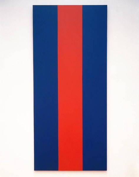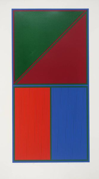 Curator: This is "Ich Nicht VIII" created by Imi Knoebel in 2006. Painted with acrylic, its use of stark geometric forms reminds me of early Modernist ideas around geometric abstraction. What strikes you? Editor: The colors! The bold primary hues really pop. The smooth surface is eye-catching, creating the impact of an industrial material, even though it's hand-painted acrylic. It almost looks as though it were assembled rather than painted. Curator: I agree. Knoebel is engaging with the legacy of movements like Neo-Plasticism but infusing it with a postmodern sensibility. The title, "Ich Nicht," meaning "I Not," perhaps hints at the artist’s withdrawal from the work, giving autonomy to form and color? Considering this piece through a framework of absence feels compelling. Editor: I'm intrigued by your focus on "absence." The title speaks volumes about authorship, but I'm equally drawn to how the materiality of these large planes directs labor and consumption. We’re so used to surfaces that mimic perfection, yet these bear traces of being handmade. It brings into question artistic intervention itself. Curator: Precisely! Knoebel is, in effect, performing and critiquing art history. How does an artist engage with a formal language tied to utopian ideals after the grand narratives of modernity have collapsed? The title implicates the artist and thus engages in a critical deconstruction of the genre. Editor: This reminds me of post-industrial landscapes, a stark beauty in man-made creation; how color-field painting's origins tie into industrial processes such as coating, and the commercial manufacture of pigments that now seem quite distanced from their initial industrial roots. Curator: And Knoebel achieves this so eloquently, making it as politically and conceptually resonant as it is visually stunning. Editor: Indeed. By focusing on how it's made, and of what it's made, this work also encourages me to confront questions of artistic skill and its social implications within modern art-making.