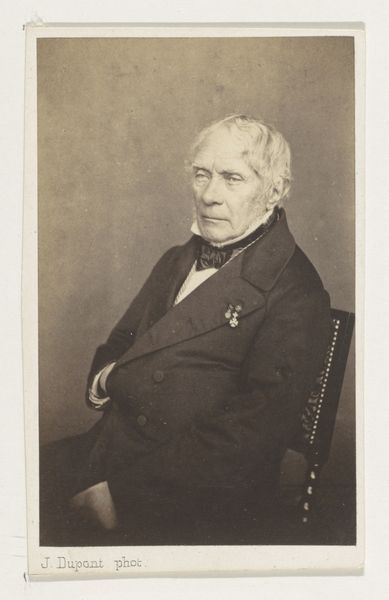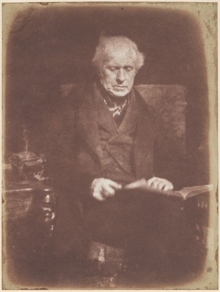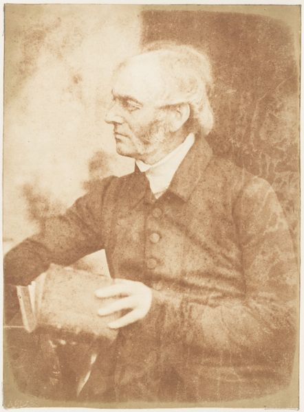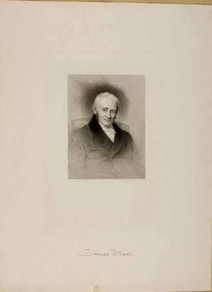 Editor: So, this is Edgar Parker's portrait of Ezekiel Price Greenleaf, painted in black and white. The gentleman looks quite serious. I wonder, what's your take on this piece? Curator: It's got that somber dignity of the 19th century, doesn't it? All that darkness swirling around his face makes me wonder, what was he thinking? Perhaps he was just tired of sitting. Editor: A long pose for a portrait, I can imagine! Curator: Exactly! What do you think that little book in his hand symbolizes? Maybe knowledge or contemplation, but perhaps just something to fidget with. Editor: Very insightful, considering this portrait. I'll definitely look at 19th-century portraits with a new set of eyes!