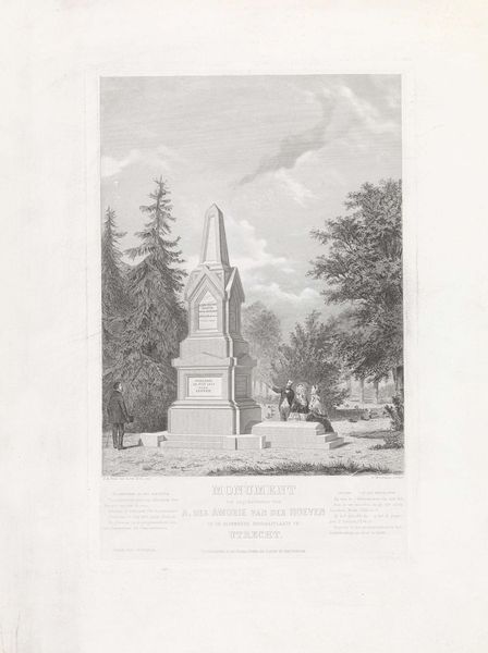 Pieter Wilhelmus van de Weijer created this artwork of the burial monument for Jacobus Ludovicus Conradus Schroeder van der Kolk using brush and gray ink. The sepia tones create a somber mood, reinforcing the theme of mortality. The monument itself is rigidly symmetrical, a stark contrast to the organic shapes of the surrounding trees. The formal, geometric structure is framed by the soft, diffuse forms of the landscape, leading the eye to the central memorial. This tension between the natural and the constructed reflects 19th-century ideas about humanity's relationship to nature and our attempts to impose order on the chaos of existence. The monument's architectural style, classical in nature, suggests a desire to connect with historical precedents, rooting the deceased in a longer narrative of human achievement. Consider how the composition uses classical forms to create a sense of permanence, juxtaposed against the muted color scheme. The artwork embodies the desire to leave a lasting mark, to transcend the transience of life.