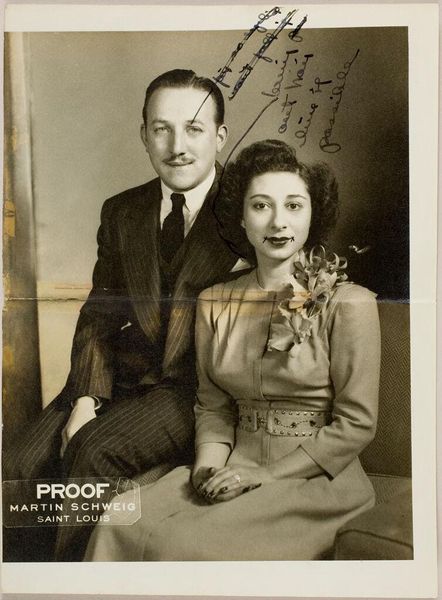 This photographic portrait, made by Robert Burian, captures a couple, the man distinguished by his military hat. The image, a silver gelatin print, speaks to the era of mass-produced photography, yet it transcends mere documentation through the artistic intervention of retouching. Retouching, a craft in itself, involves the manual alteration of the photograph's surface to enhance or idealize the subjects' appearance. This careful manipulation highlights the cultural significance attached to portraiture, where the desire to present a flawless image reflects societal expectations of beauty and status. The very act of commissioning such a portrait, then enhancing it with skilled handwork, underscores the value placed on personal representation. This challenges the industrial nature of photography, adding layers of meaning through the labor-intensive process of crafting an ideal image.