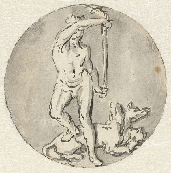 Curator: This intriguing wood engraving is by John Linnell, who lived from 1792 to 1882. Currently untitled, it resides in the Tate Collections. Editor: It's stark, dramatic. The figures feel caught in a moment of intense struggle, yet the lines are so clean, almost classical. Curator: Linnell was deeply engaged with social issues. Notice the implied power dynamics here. The standing figure, seemingly dominant, almost violently controlling the other. Editor: Yes, and the dogs mirror that tension. Throughout history, the dog has symbolized loyalty, but here, their posture suggests a more predatory instinct. They're part of the oppressive narrative. Curator: Precisely. One could interpret this as a commentary on systemic power imbalances. The artist seems to be engaging with the philosophical discourse around domination. Editor: It’s fascinating how Linnell uses such simple imagery to evoke such complex themes. It makes me consider how symbols evolve and reflect our collective anxieties. Curator: It’s a powerful reminder that art can be both beautiful and a catalyst for critical reflection on societal structures. Editor: A stark, unsettling piece that clearly demonstrates how potent visual allegory can be.